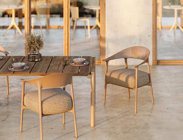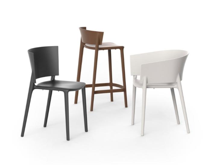 La gamme de finitions « BASIC PP » couvre des tons sobres et actuels—White, Ecru, Tortora, Cream, Clay, Black, Jade, Ocean—faciles à marier entre eux ou avec des tables Vondom (ex. Mari-Sol, Tulum). Certains modèles sont proposés avec coussins ou tapisseries (tissus outdoor acryliques, déclinés dans plusieurs collections coloristiques), afin d’augmenter encore le confort d’assise et d’harmoniser la palette matière d’un projet. Pour les environnements contract, c’est un vrai plus : un même dessin, plusieurs niveaux de confort et d’expression.