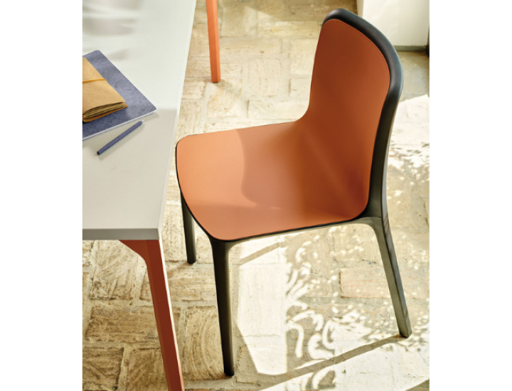 Chaise avec 4 pieds et sans accoudoirs à deux composants : un cadre et une coque assise-dossier. Le cadre structurel est en polypropylène (PP) et emprisonne la coque assise-dossier en polypropylène (PP), pour une esthétique lisse et avenante de la chaise. 4 butées en polyéthylène sous l’assise permettent d’empiler plusieurs chaises. Patins en élastomère thermoplastique (TPE). Diverses finitions de la coque pour une chaise polyvalente et tonique.