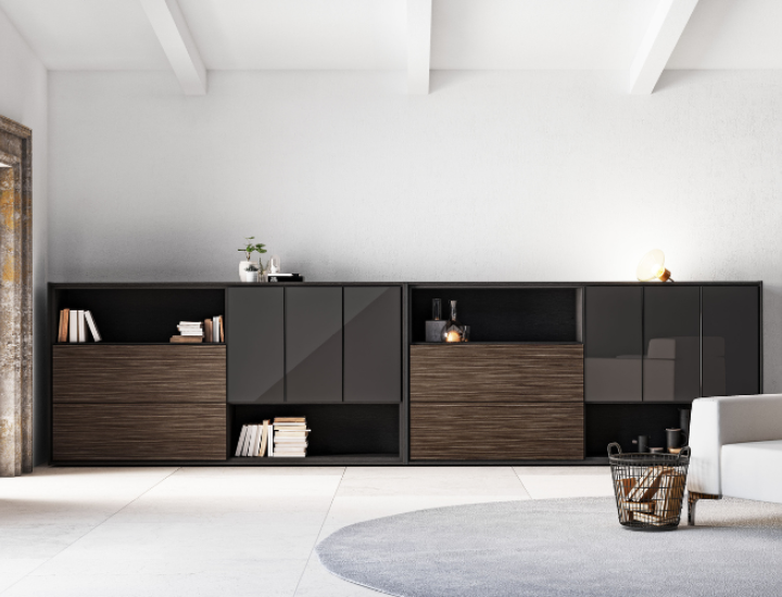 Structure en panneaux de particules de 18 mm avec chant mélaminé de 0,4 mm. Façades et top en panneaux de particules de bois avec chant ABS de 2 mm. Tiroirs bois avec serrure centralisé, coté en fibre de bois d'épaisseur de 12 mm avec revêtement PVC noir, fond en fibre de bois et Glissières métal avec roulement nylon, poignées en polypropylène. Patins de réglage hauteur en nylon et fermeture self-closing sur 15 mm. Tablette en panneaux de particules de bois de 25 mm avec chant mélamine de 0,4 mm. Façades et portes disponible en 3 versions de fintions : Mélamine (en panneaux de particules bois de 35 mm revêtement mélaminé avec chant ABS), en Fenix ® (panneau de particule de bois 12 mm avec revêtement FENIX ® de 0,9 mm) et Essence de bois (en panneaux de particules bois de 35 mm revêtement placage de bois pré-mélangé . Tout les meubles doivent être compléter avec top et coté de finition.