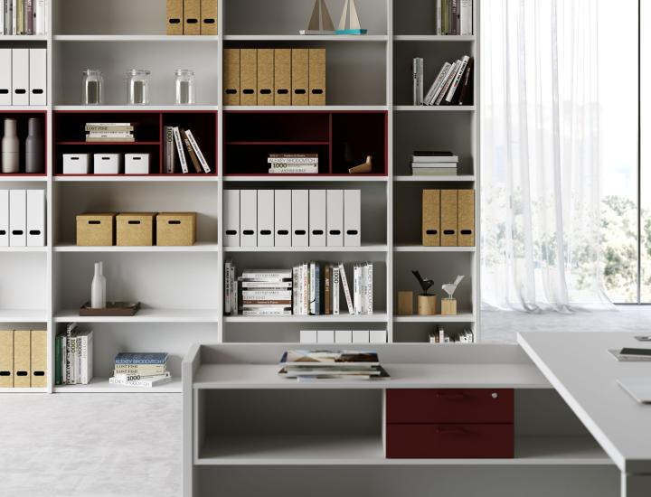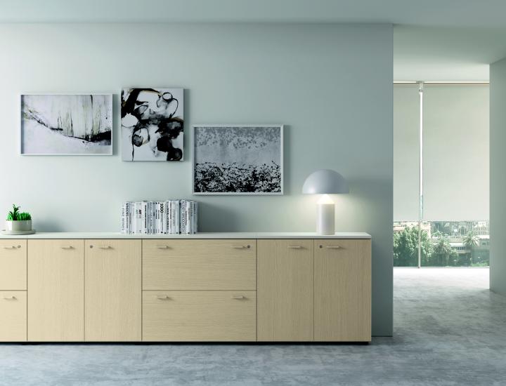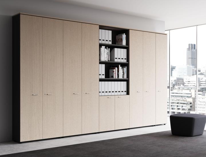 Structure en panneau de particule de bois de 18 mm avec chant mélamine Verins de réglage hauteur en nylon noir sur course de 15 mm. Les étagères sont en panneau de particule de bois de 25 mm revêtement mélamine avec chant mélamine de 0,4 mm, possibilité sur demande d'étagères en métal. Les façades et portes sont en panneau de particules de bois de 18 mm avec chant ABS, les charnières de porte s'ouvrent à 110°, sont disponibles avec les portes; des amortisseurs pour fermeture. Pour les portes vitrées, il y a deux types de configurations, avec ou sans chassis, avec verre trempé satiné ou transparent avec ou sans serrure et poignée à pont ou poignée forme pommeau.