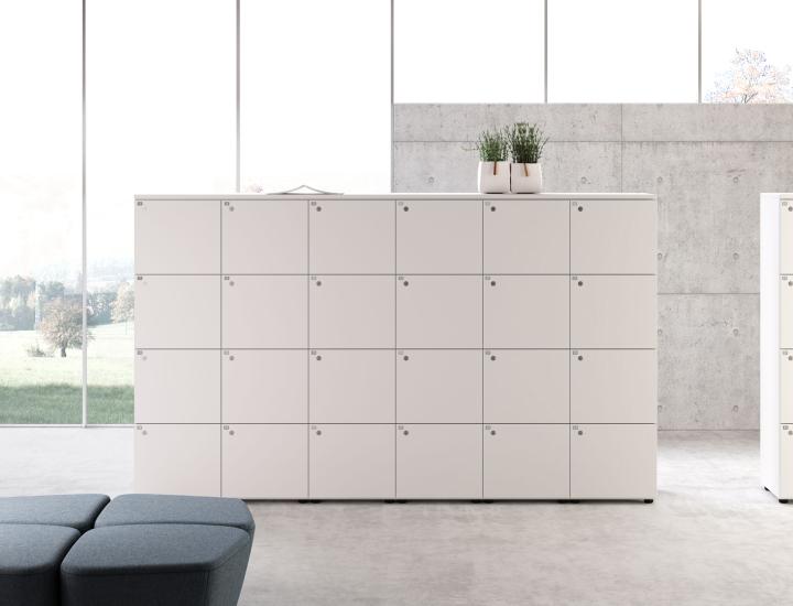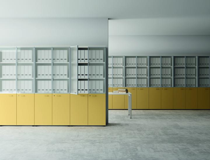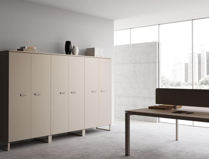 Structure en panneau de particule de bois de 18 mm avec chant mélamine Verins de réglage hauteur en nylon noir sur course de 15 mm. Les étagères sont en panneau de particule de bois de 25 mm revêtement mélamine avec chant mélamine de 0,4 mm, possibilité sur demande d'étagères en métal. Les façades et portes sont en panneau de particules de bois de 18 mm avec chant ABS, les charnières de porte s'ouvrent à 110°, sont disponibles avec les portes; des amortisseurs pour fermeture. Pour les portes vitrées, il y a deux types de configurations, avec ou sans chassis, avec verre trempé satiné ou transparent avec ou sans serrure et poignée à pont ou poignée forme pommeau.