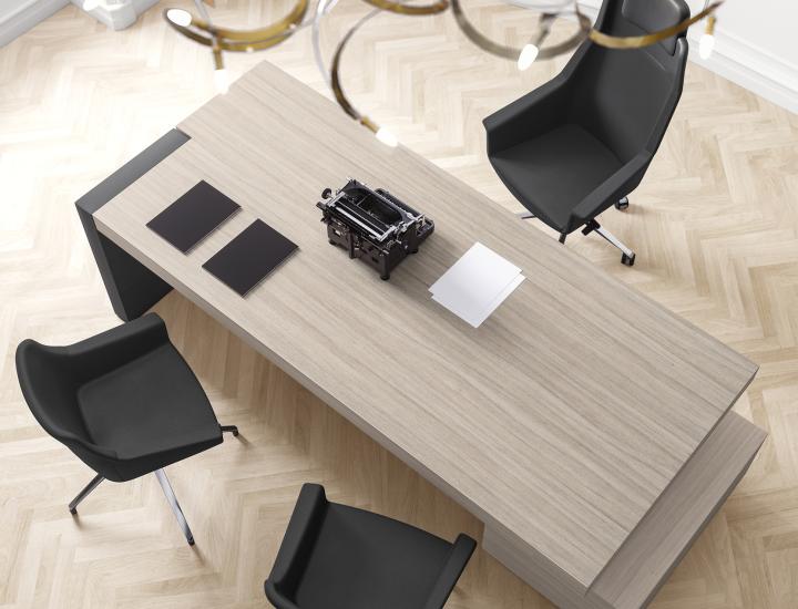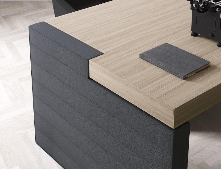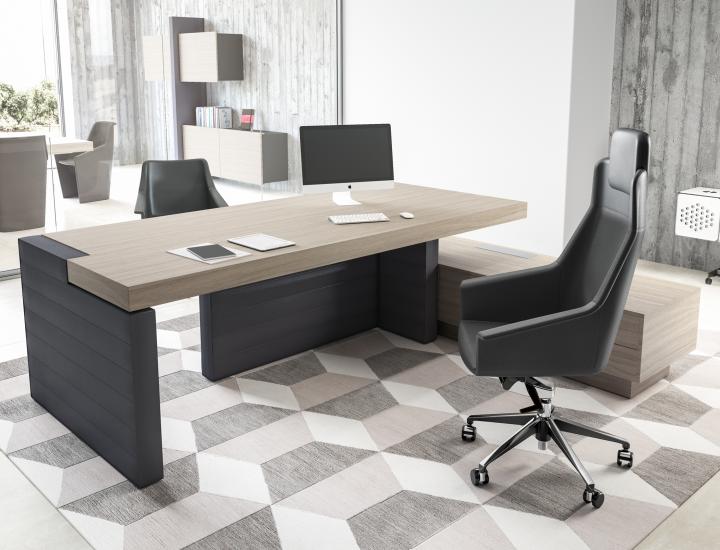 Deux versions sont disponibles pour cette gamme : Bureau droit (avec joues et fond en ECO-PELLE), Bureau avec retour (avec joues et fond en ECO-PELLE). Le plateau est composé d'une structure autoportante avec revêtement en panneau MDF de 18 mm, carcasse interne en panneaux de particules de 18 mm. épaisseur totale du plateau 90 mm. Le piètement est assuré par des rampes en nylons de 10 mm munies de feutres à nivellement automatique. Le plateau et la structure sont relié entre eux par des pattes de soutien en alliage de Zamak moulé sous pression de 10 mm. Pour le retour : Structure interne en panneaux de particules de bois de 18 mm sur bords mélaminé de 0,4 mm. Plinthe / façade / portes / fond / cotés / top en panneaux de fibres de bois en MDF de 18 mm. Les tiroirs sont composé de panneaux de particules de bois de 12 mm sur bords mélaminés de 0,4 mm. les portes et les tiroirs s'ouvre et se ferme grâce au système push-open.