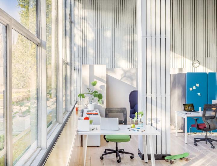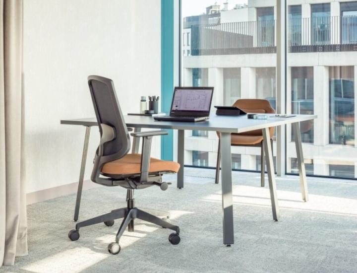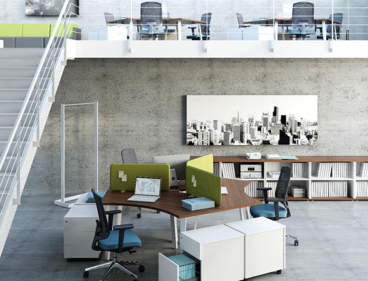 Bureau Opératif Plateau mélaminé de 28 mm certifié FSC et PEFC avec les chants ABS, Piètement à section rectangulaire 60 x 30 mm, oblique et vissé par 4 Vis de fixation sur le plateau. il est également pourvu de réajuster vissable en PVC sous les piètements. Possibilité d'y adjoindre un Top Access, une Médiabox ou des passes-câbles. Ainsi que d'un panneau de séparation acoustique ou non.