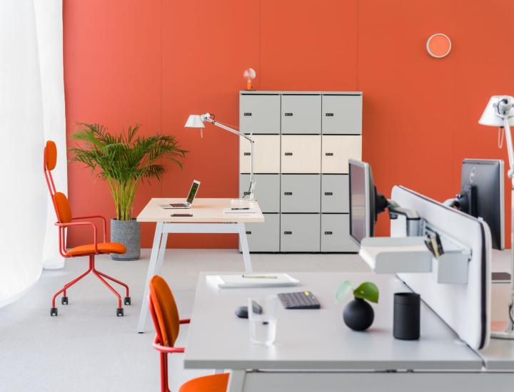Bureau opératif Plateau mélaminé de 28 mm certifié FSC et PEFC avec les chants ABS, Piètement à section carré de 40x40 mm, légèrement oblique et fixé sur une poutre transversale en métal de 30x60 mm en finition peinture époxy, le tout monté sous le plateau avec une entretoise de 10 mm. Sous le piètement, des vérins de réglages de 25 mm de diamètre pour permettre de parfaitement régler le bureau à l'horizontale. Il sera possible de mettre en place un montage sur un caisson de rangement disposé en L. On pourra y rajouter des passes-câbles, un Top-access ou un médiabox.