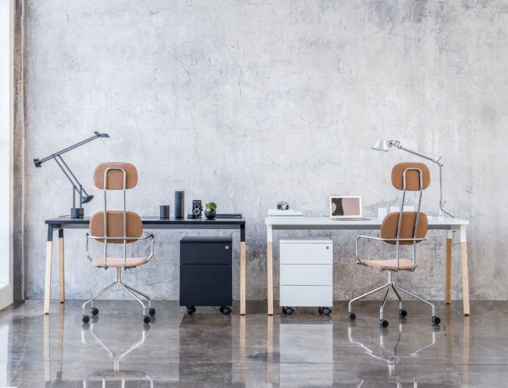 Bureau opératif Plateau mélaminé de 28 mm certifié FSC et PEFC avec les chants ABS, Piètement à section carré de 40x40 mm, légèrement oblique et fixé sur une poutre transversale en métal de 30x60 mm en finition peinture époxy, le tout monté sous le plateau avec une entretoise de 10 mm. Il sera possible de mettre en place un montage sur un caisson de rangement disposé en L. On pourra y rajouter des passes-câbles, un Top-access ou un médiabox.