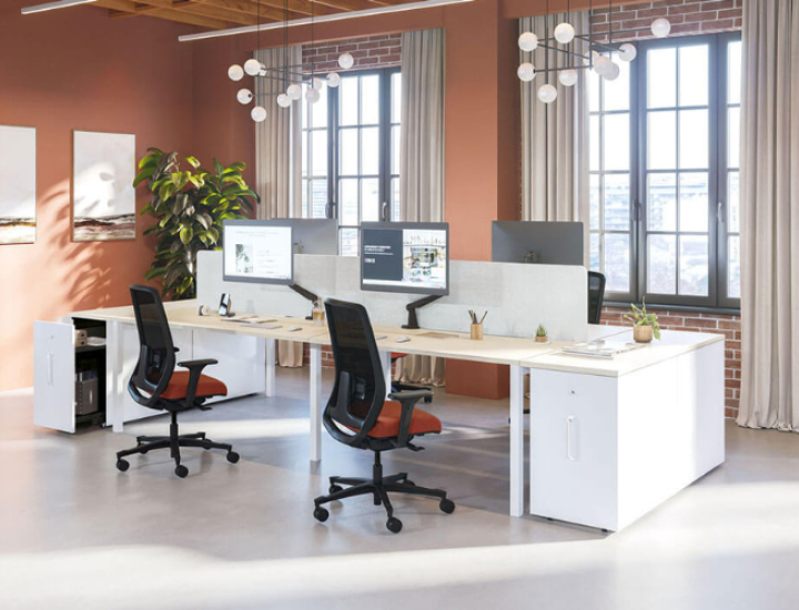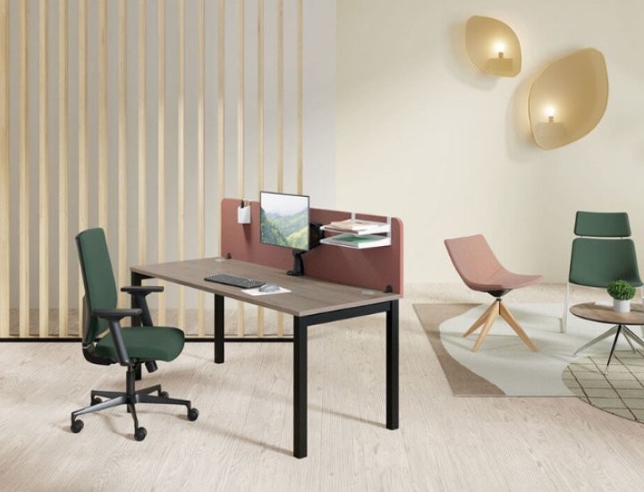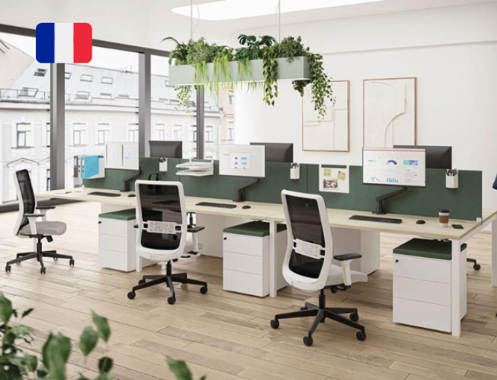 Le bureau OPTIM est composé d'un plateau en mélaminé de 25mm d'épaisseur et de pieds en métal disponibles en 3 couleurs : blanc, gris et noir.