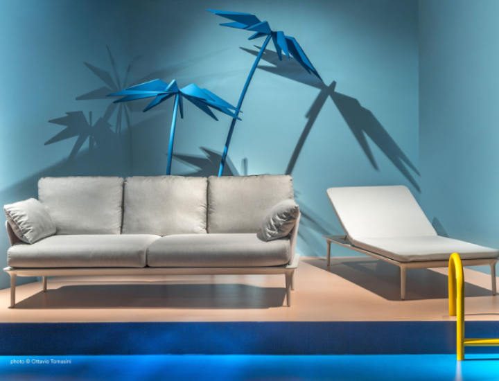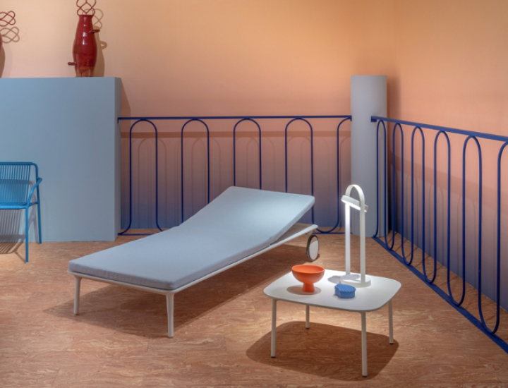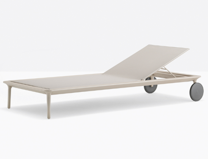 CHAISE LONGUE REVA La structure est en aluminium extrudé avec pietement moulé sous pression, le cadre de réglage du dossier ainsi que les renforts sont en acier inoxydable. Les guides de réglages sont polypropylène. Le textile du support est en textilène. La finitions structurelle est en poudre époxy. Les roulettes de Ø195 mm sont en nylon avec un caoutchouc noir et disque blanc.