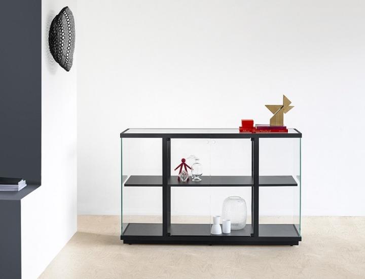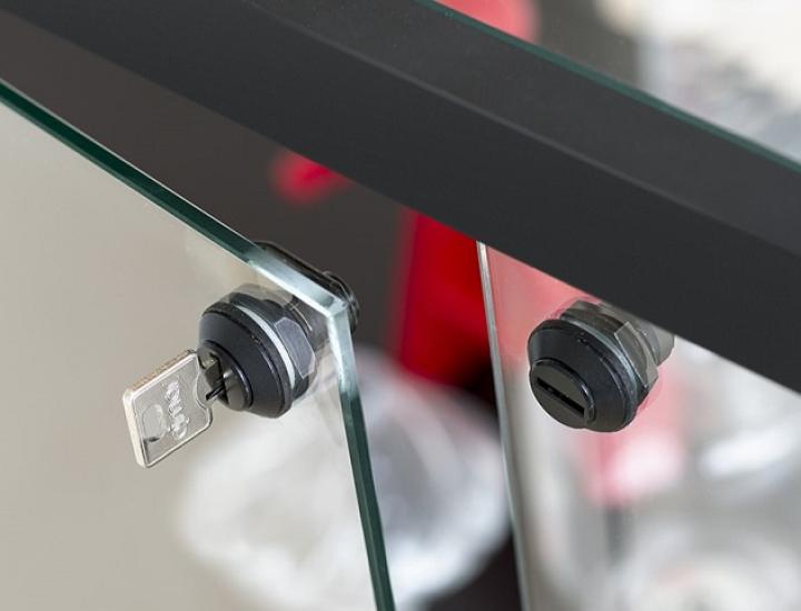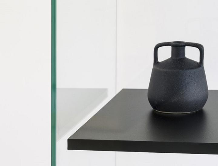 Profilés en aluminium enduit d'époxy structuré noir avec verre trempé de 5mm et 2 portes. Le socle, les étagères et le panneau supérieur sont en plaque d'aggloméré mélaminé noir. Un éclairage LED est présent à l'intérieur, au niveau du panneau supérieur et des étagères. Dimensions disponibles : 145x181x45 et 145x92x45.