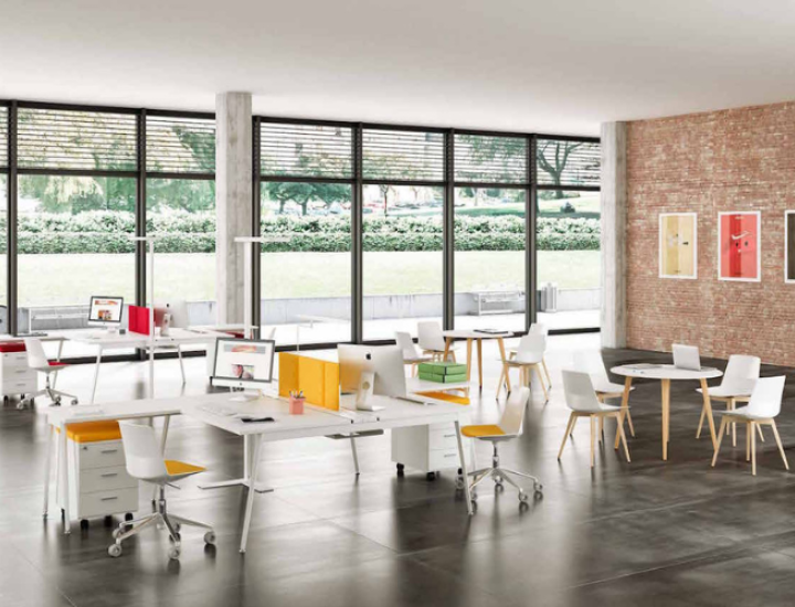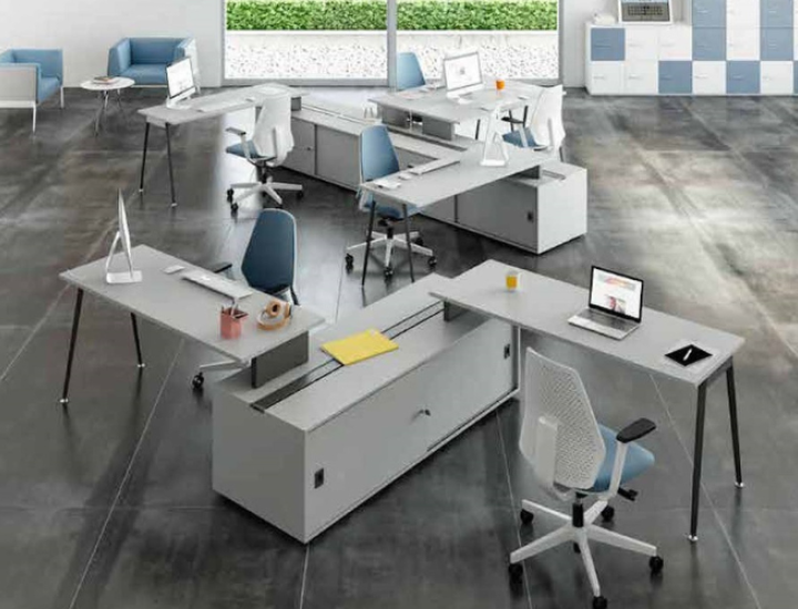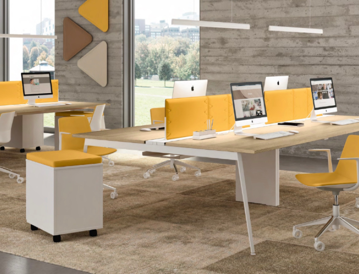 Bureau opératif Plateau mélaminé anti-reflet de 25 mm avec chant ABS de 2mm. Piètement 32 x 32 mm et cadre en métal vérins ajustable en polyamide et métal pour nivellement sur 25 mm avec base circulaire de 38 mm de diamètre. Piètement en bois en option 32 x 32 mm. Pour les benchs, possibilité de disposer de pieds panneaux intermédiaire pour y intégrer le passage de câbles. Top-access, passe-câble, goulotte.