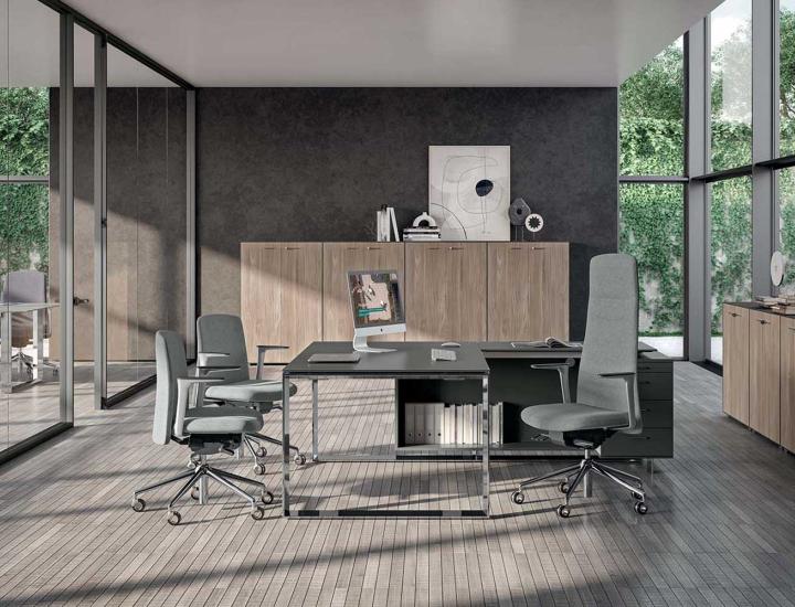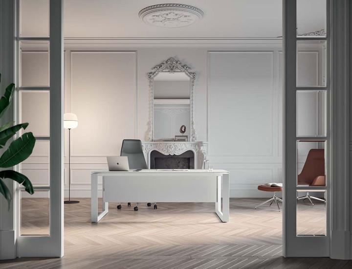 Bureau de Direction Trois types de plateau disponible : Plan de travail en Panneau mélamine MFC de 18 mm, revêtement papier de mélamine anti rayure et anti reflet avec chant ABS / Plan de travail des bureaux en mélamine laqué, plan de travail en aggloméré de 18 mm avec revêtement de mélamine anti-rayures anti-reflet, vernis laqué mat de 10 mm avec chant ABS / Plan de travail en verre, réalisés en verre trempé de 10 mm, satinés dans la partie supérieure et vernis dans la partie inférieure, plaque de fixations en acier. Structure en tôle d'acier vernis en époxy ou chromé. Deux piètements disponibles : pont et rubans section pentagonale 94 x 30 mm de 2 mm